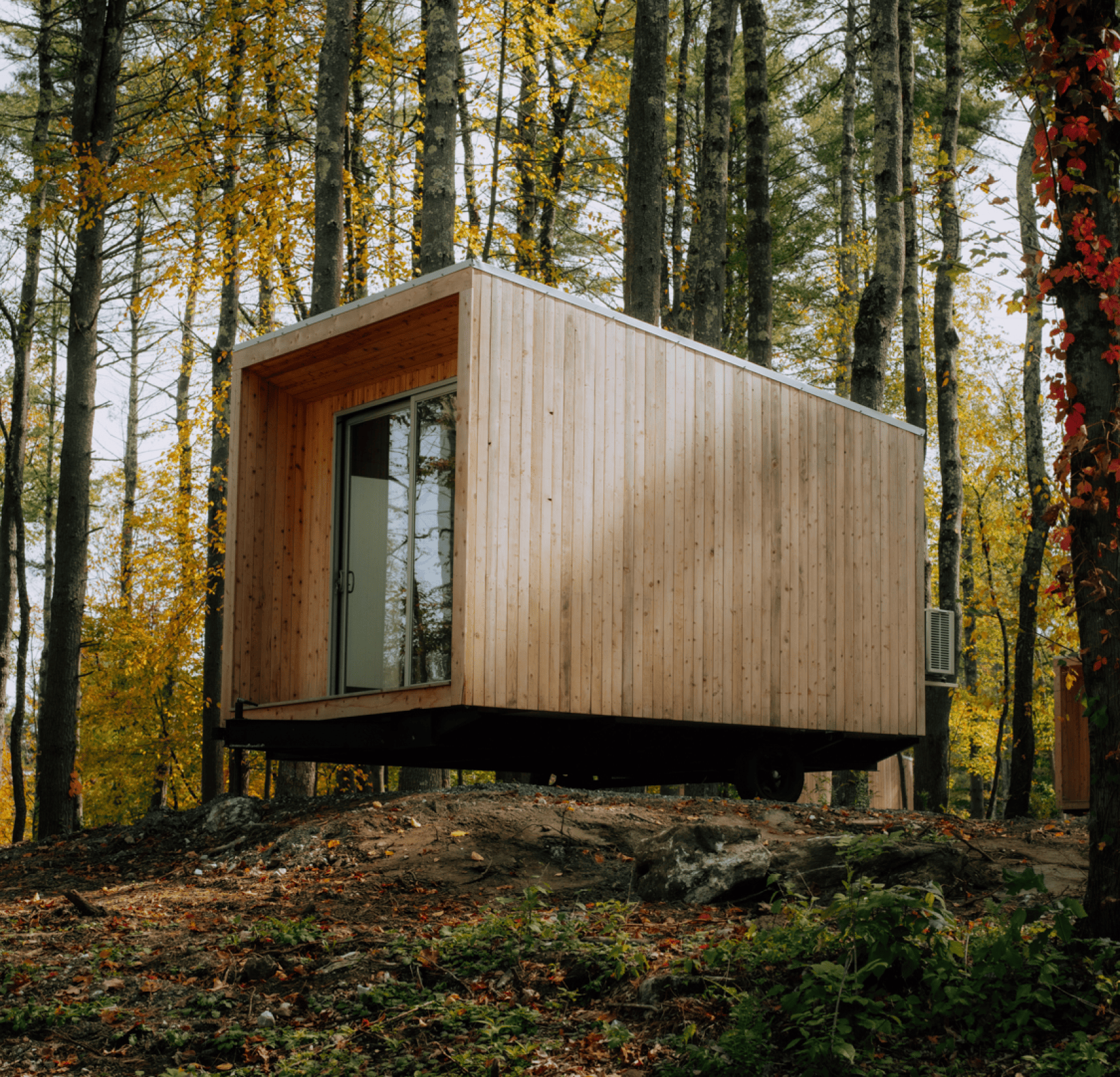 Perched on a gently raised knoll with views of both forest and lake, the Knoll Cabins offer year-round connection to the outdoors. Hand-built from wood, stone, and glass, these cabins balance privacy with proximity to Prospect’s lakeside amenities, walking trails, and gathering spaces. Designed for couples or small families, each cabin offers a minimal, light-filled interior shaped by natural materials and uninterrupted views.